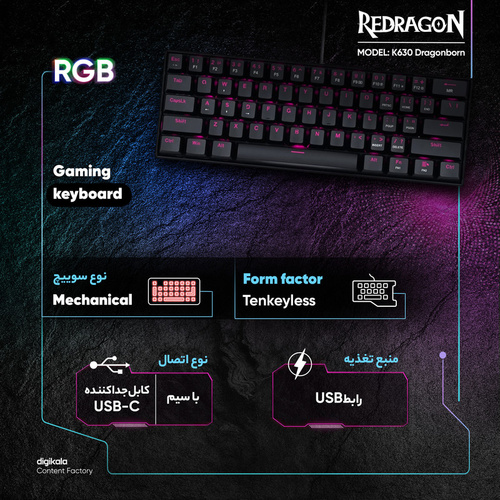 کیبورد گیمینگ و مکانیکی ردراگون مدل K630 Dragonborn محصولی حرفهای از برند « ردراگون » (Redragon) است که برای کاربران علاقهمند به بازی طراحی و تولید شده است. گیمرهایی که هنوزه همچنان از کامپیوتر برای بازی استفاده میکنند میدانند کیبورد بدون شک یکی از اصلیترین وسیله ها برای یک گیمر است . شاید از دید یک کاربر معمولی تفاوت آنچنانی بین کیبوردها با هم نداشته باشند و حتی تنها تفاوت آنها در ظاهر باشد. اما در هنگام بازی فقط یک گیمر حرفهایی که از کامپیوتر برای بازی استفاده میکند متوجه تفاوت بین کیبورد معمولی و مکانیکال میشود. کیبورد گیمینگ ردراگون مدل K630 Dragonborn دارای طراحی ساده و شیک خود است، طوری که کاربر در نگاه اول جذب سادگی و زیبایی آن میشود. کمپانی بزرگ Redragon با این طراحی ساده و مینیمال باعث شده تا کاربر در درازمدت جذابیت ظاهری کیبورد برای آن از دست نرود. برای ساخت کیبورد گیمینگ ردراگون مدل K630 Dragonborn کمپانی ردراگون از فلز و ABS استفاده کرده است که باعث کیفیت خوب این کیبورد میشود. کیبورد K630 Dragonborn قسمت Num Pad از آن حذف شده و مجموعاً 61 عدد کلید دارد که باعث جمعتر شدن آن است. کیبورد مخصوص بازی ردراگون مدل K630 Dragonborn دارای نور پس زمینه RGB با قابلیت تغییر تک تک کلیدها است که علاوه بر ظاهر زیبایی برای کیبورد ایجاد کرده، باعث میشود در شب و تاریکی به بهتر دیده شدن دکمه ها به شما کمک کند و همچنین این قابلیت را به شما میدهد که نور پس زمینه را به 18 حالت با توجه به سلیقه شخصی خودتان تنظیم کنید. از آنجایی که پورت USB را میتوان پورت استاندارد برای اتصال تمامی دستگاهها دانست کمپانی ردراگون برای اتصال این کیبورد به کامپیوتر از کابل USB Type-C به USB-A جدا شونده استفاده کرده است. این کیبورد ضد آب نبوده اما در برابر پاشیده شدن مایعات و رطوبت مقاوم است و احتمال آسیب دیدن آن بسیار کم است و نگرانی برای شما ایجاد نمیکند. ناگفته نماند که سویچ کلیدهای این کیبورد قرمز است.
