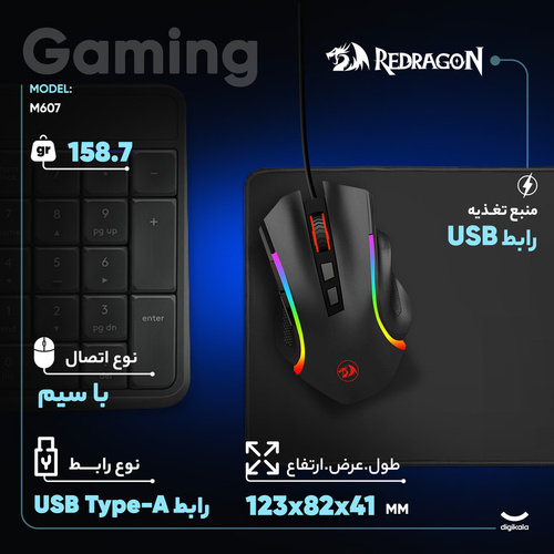 ماوسها از نظر نوع طراحی و امکاناتی که در اختیار کاربر میگذارند، به انواع مختلفی تقسیم میشوند. ماوس مدل M607 محصولی از برند « ردراگون » (Redragon) است که برای استفادهی علاقهمندان به بازی و گیمرها ساخته شده است. وجود نورهای RGB هم در این ماوس وجود دارند تا نظر گیمرها را هم بیش از پیش به خود جلب کنند. ماوسهای مخصوص بازی معمولاً از کیفیت ساخت بالاتری نسبت به ماوسهای معمولی بهره میبرند. علاوهبر کیفیت ساخت و مقاومت در برابر انواع صدمات، میزان دقت آنها هم بالاتر است. ماوس M607 از دقت بالایی برخوردار است و میتوان دقت آن را بین 800 تا 7200 نقطه بر اینچ تنظیم کرد که میزان بسیار مطلوبی است. این ماوس از نوع سیمی است و با استفاده از کانکتور USB به کامپیوتر متصل میشود و کاربر را در انجام بازی یاری میدهد. اگر به دنبال ماوسی کاربردی و ارزشمند برای بازی هستید، این ماوس ردراگون را به عنوان محصولی کاربردی درنظر داشته باشید.